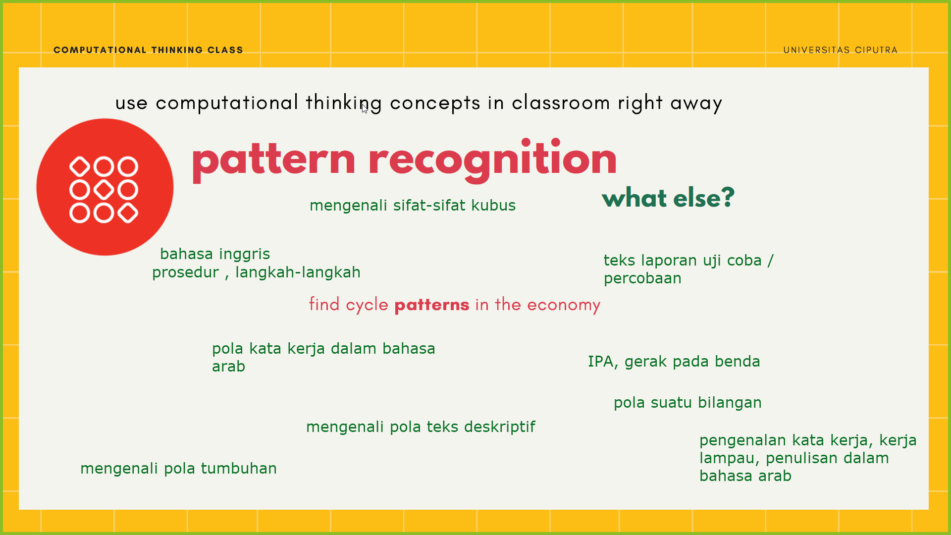 Sebagai kampus yang berkomitmen untuk mempersiapkan para guru dari sekolah-sekolah menghadapi era digital, Universitas Ciputra telah memperkenalkan konsep berpikir secara logis dan matematis melalui mata pelajaran Teknologi Informasi dan Komunikasi.Melihat pentingnya memberikan pemahaman yang lebih mendalam tentang Teknologi Informasi dan Komunikasi. Oleh karena itu, diadakannya untuk menyelenggarakan sebuah workshop, dengan tujuan memberikan tambahan wawasan dan pengalaman praktis kepada para guru-guru. Workshop dengan tema Computational Thinking for Your Future dibawakan oleh Dipl.-Inf. Laura Mahendratta Tjahjoko dan timnya dari Universitas Ciputra, Surabaya. Workshop ini bertujuan untuk memperkenalkan konsep Computational Thinking kepada para guru dengan cara yang menyenangkan dan menarik